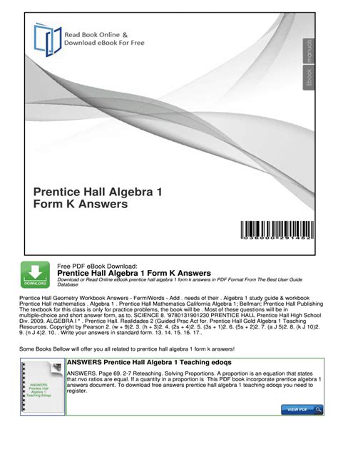 Download Prentice Hall Algebra 1 Answers Assessment PDF online is a convenient and frugal way to read Prentice Hall Algebra 1 Answers Assessment you love right from the comfort of your own home. Yes, there sites where you can get PDF "for free" but the ones listed below are clean from viruses and completely legal to use.